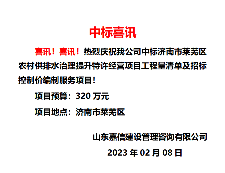 热烈庆祝我公司中标济南市莱芜区农村供排水治理提升特许经营项目工程量清单及招标控制价编制服务项目