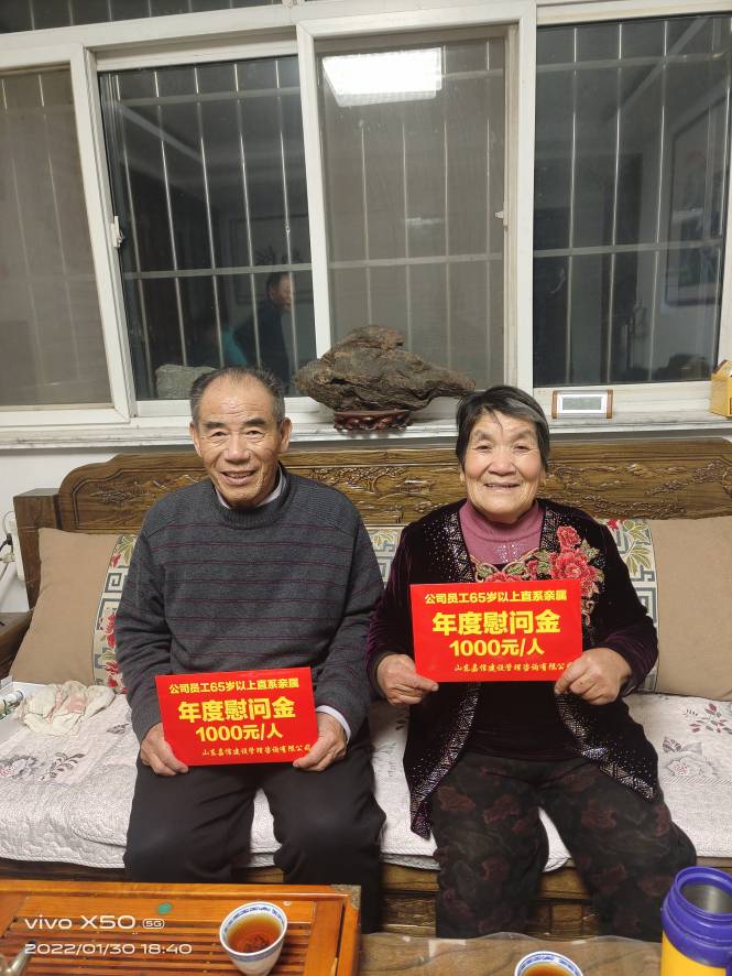 春节来临,为使员工欢度新春佳节,山东嘉信为员工65岁以上亲属发放年度慰问金1000元/人,共发放71人。